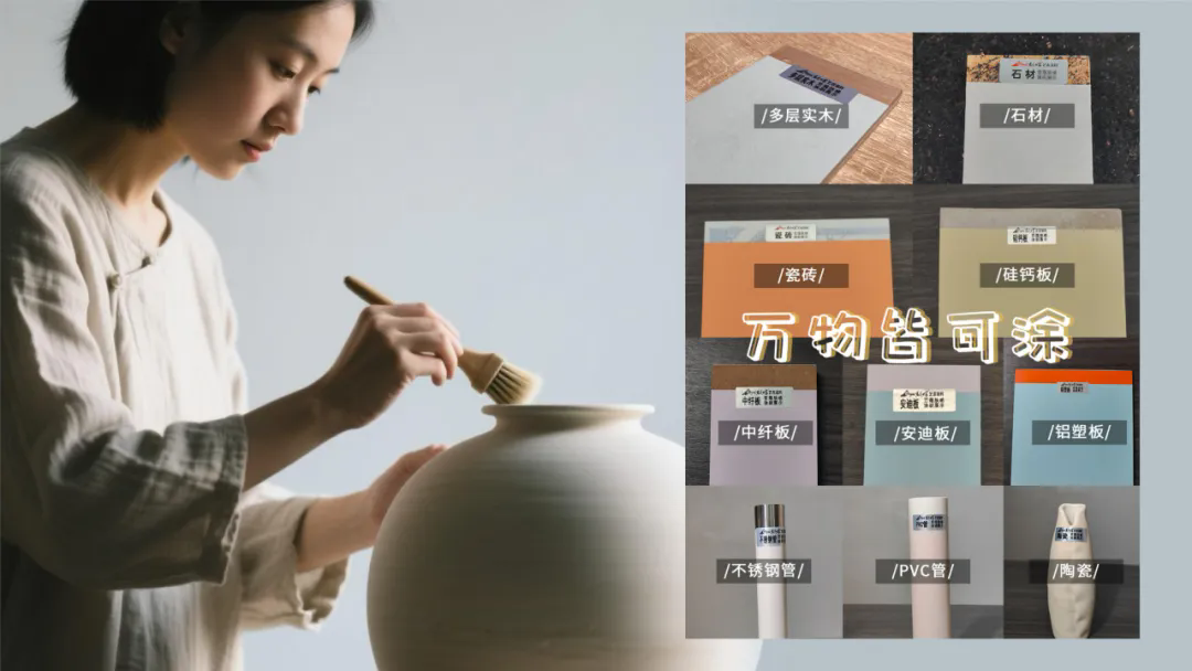 別以為它只能刷墻!「附著力強 + 多材適用」的特性,無論是溫潤的實木、冷峻的金屬、光潔的陶瓷,還是現(xiàn)代感十足的塑料與不銹鋼基材,都能完美附著,呈現(xiàn)統(tǒng)一細膩的膚感效果。突破傳統(tǒng)涂料的材質(zhì)局限,讓不同介質(zhì)的表面都能獲得如嬰兒肌膚般的柔潤觸感,實現(xiàn)真正意義上的全材質(zhì)美學(xué)覆蓋,更妙的是「修補無差」特性:哪怕墻面被不小心刮花,補刷后新舊漆膜顏色完全一致,就像情緒偶爾有裂痕,卻能被溫柔撫平。