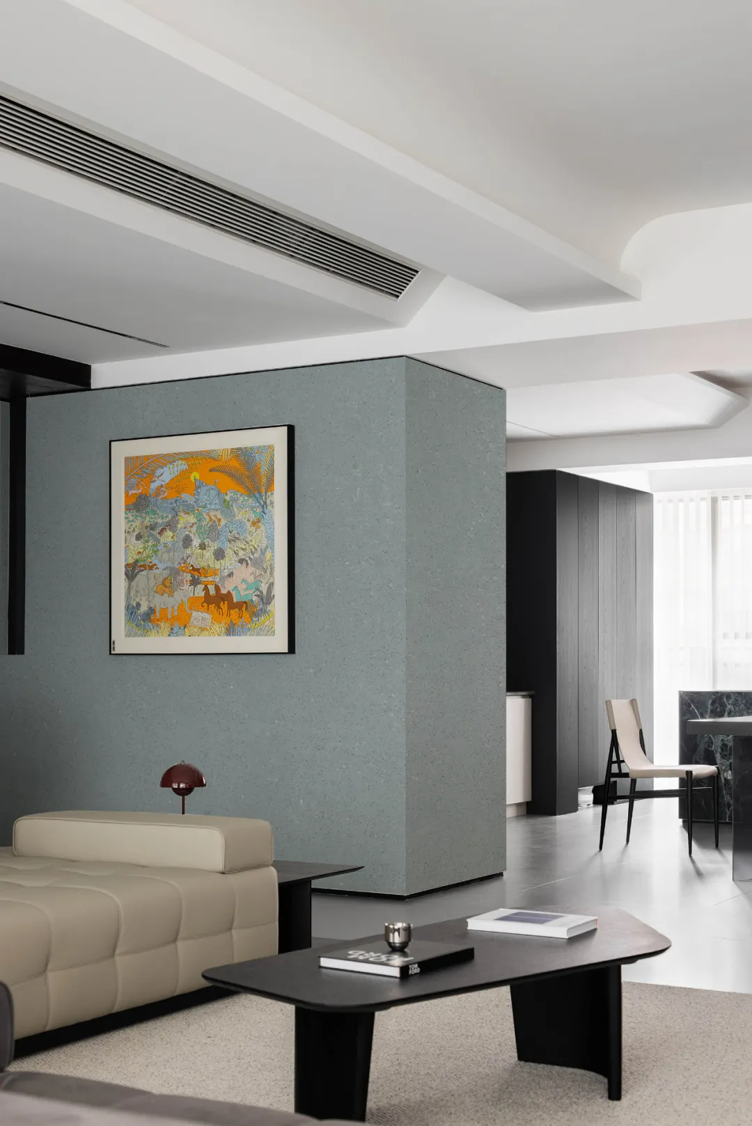 低飽和度中性色與局部亮色點綴的完美結(jié)合。星河巖2501號高級灰墻面與黑色家具、米色沙發(fā)構(gòu)成柔和的中性色基底,墻上的藝術(shù)畫以亮色打破沉悶,質(zhì)感細(xì)膩且粗獷的星河巖完美契合現(xiàn)代極簡風(fēng)格的“簡潔、純粹”。