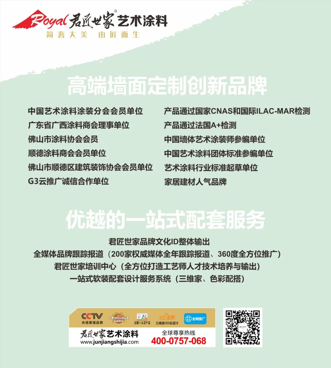君匠世家作為藝術涂料行業(yè)標準起草單位,從成立初始即以嚴格的品質管控和技術創(chuàng)新為依托,洞察國際國內(nèi)流行趨勢,將純正的產(chǎn)品帶給國人,致力于將輕奢體驗、潮流時尚、健康環(huán)保的理念完美詮釋于多樣化的產(chǎn)品中!